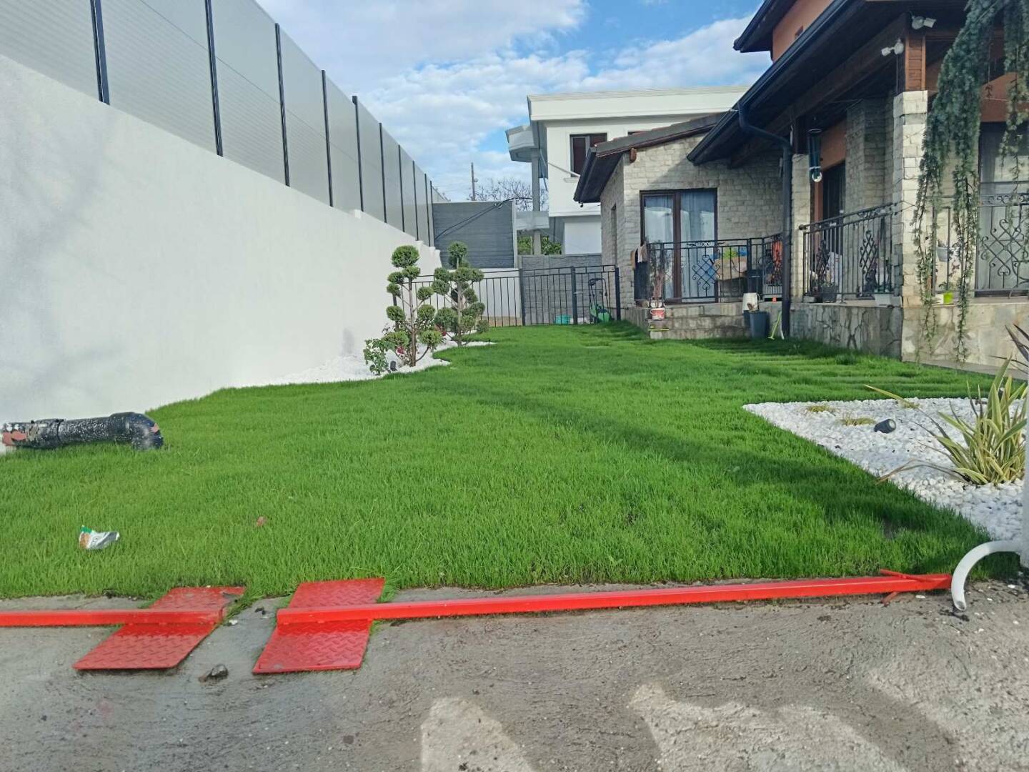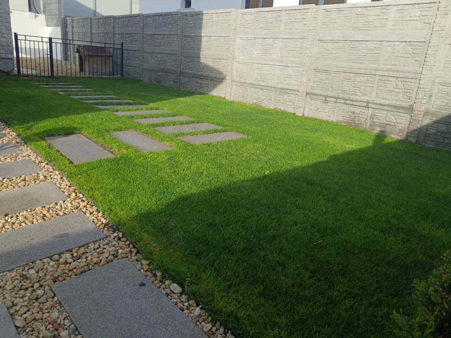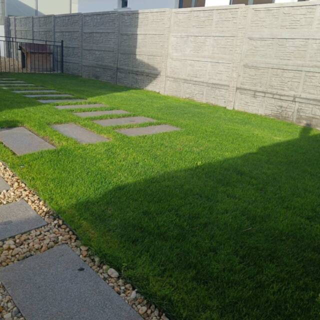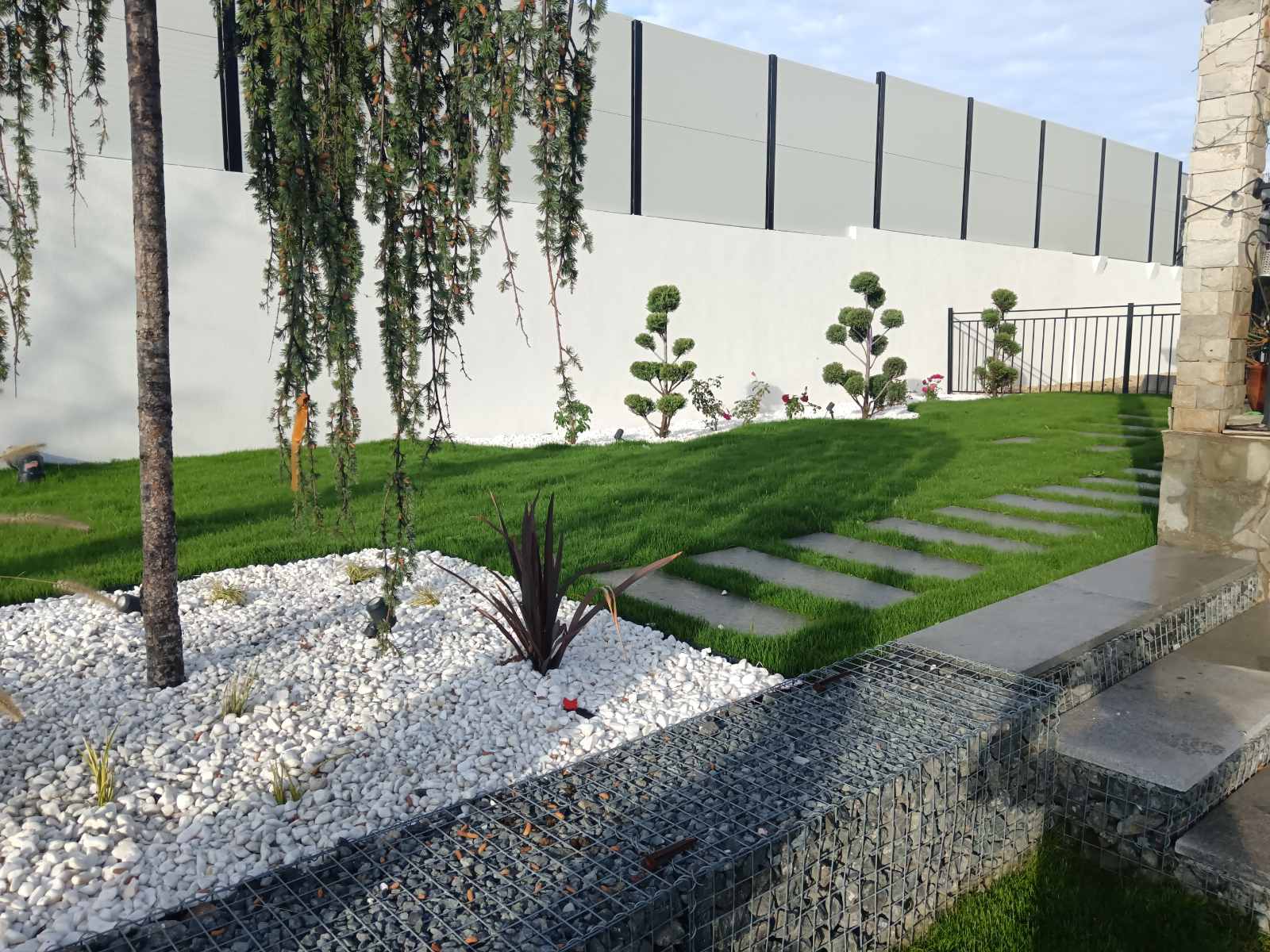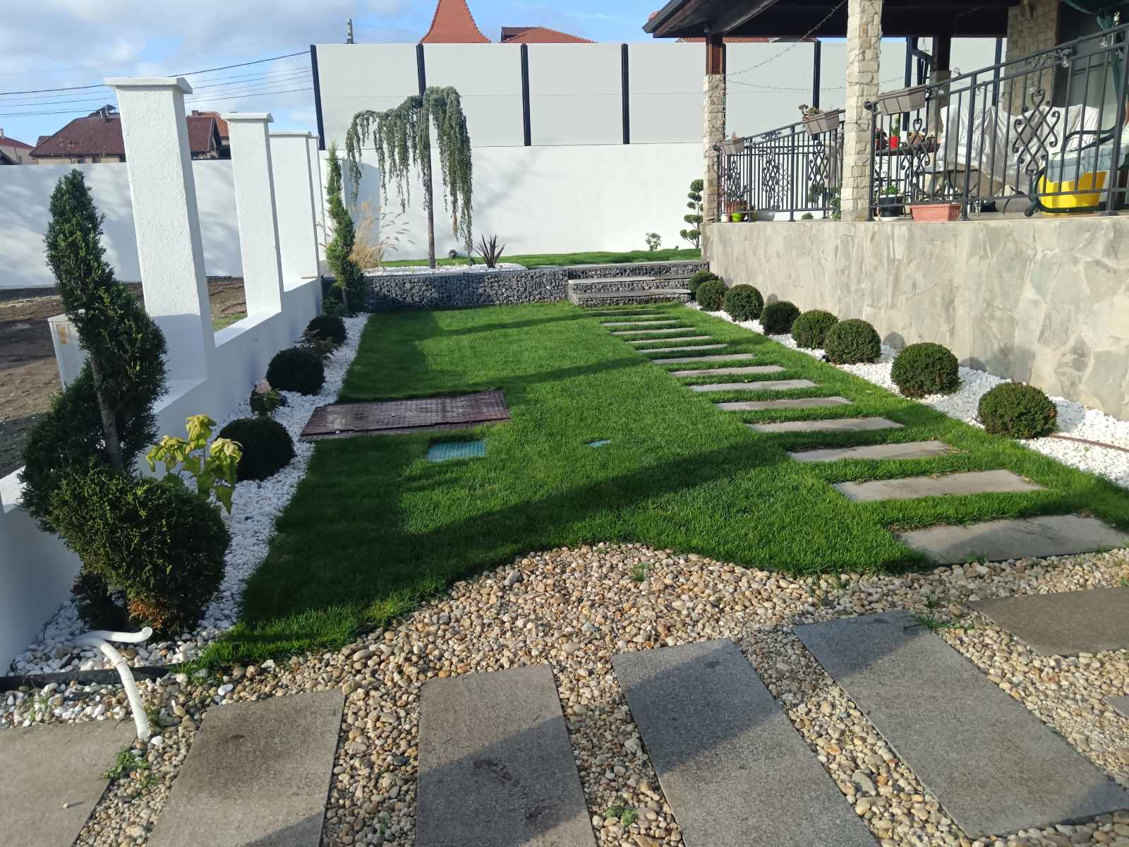 След уточненията по растителността и оформлението, подготвихме точна оферта за озеленяване и поливна система. Проектът включваше озеленяване на двор с денивелация, затова изградихме подпорна стена от габиони и стъпала със същата система за достъп до горно ниво.
