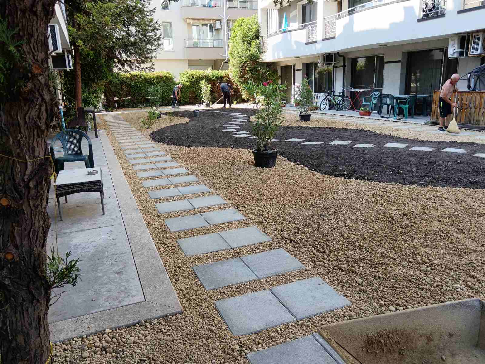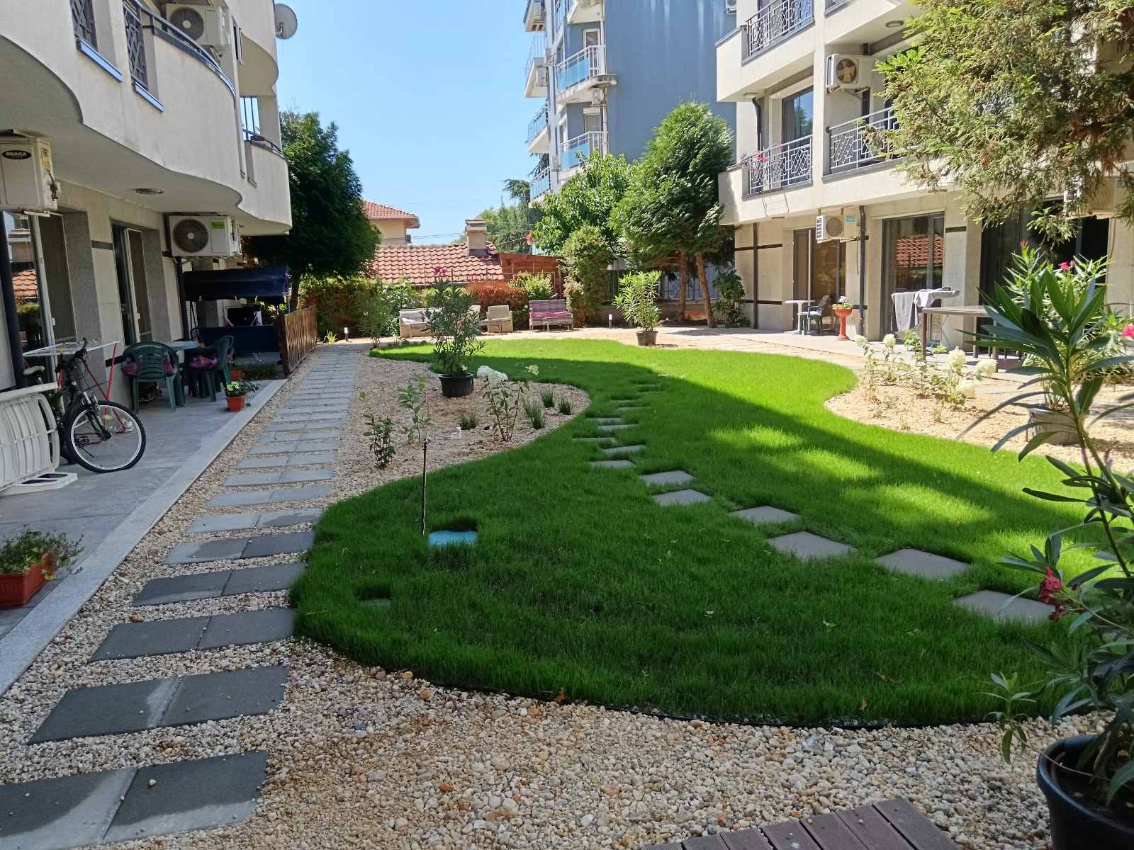 Работихме върху бетонирано пространство между две сгради, в което имаше минимален почвен насип (10–15 см) и само в част от зоната възможност за реално засаждане. Предизвикателството не беше само в терена, а и в нуждата да координираме желанията на близо 60 апартамента. Подготвихме два варианта за проект – геометричен и пейзажен. Живущите избраха пейзажния, който реализирахме с много внимание и адаптивност.